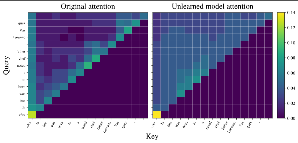 Where is the binary mask for the target concept and is the normalization factor. This effectively redistributes attention mass to neutral, low-entropy tokens (like punctuation), dissolving the factual link without damaging the linguistic structure.