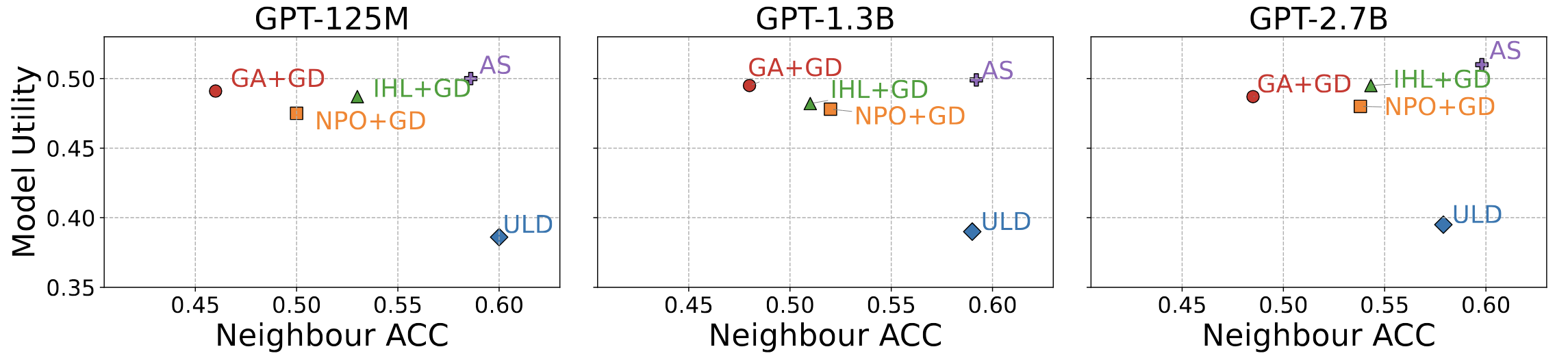 Figure 2: TDEC Performance Matrix. M-NAAR (top right) consistently maintains the optimal trade-off frontier between Utility and Unlearning across model sizes.